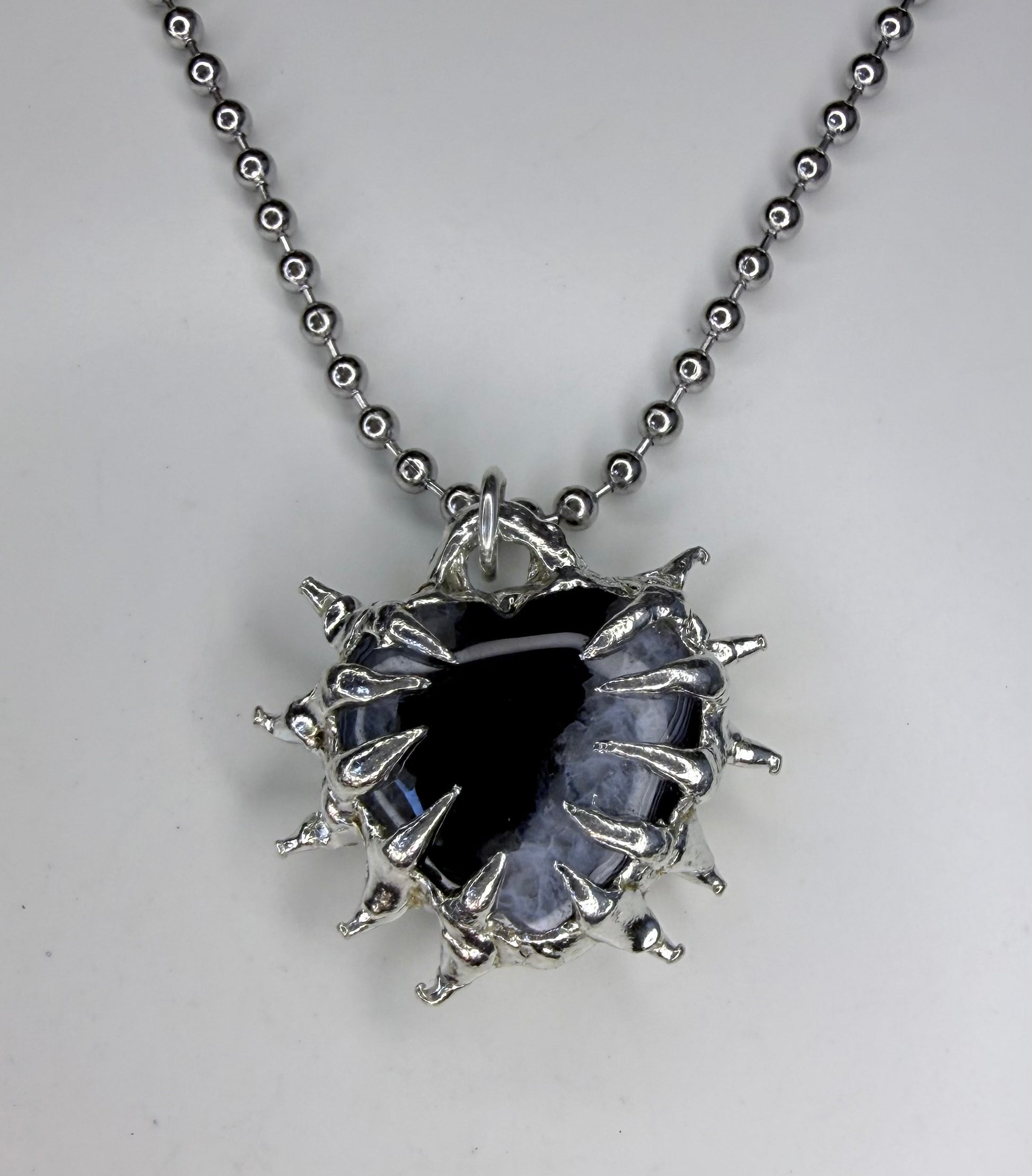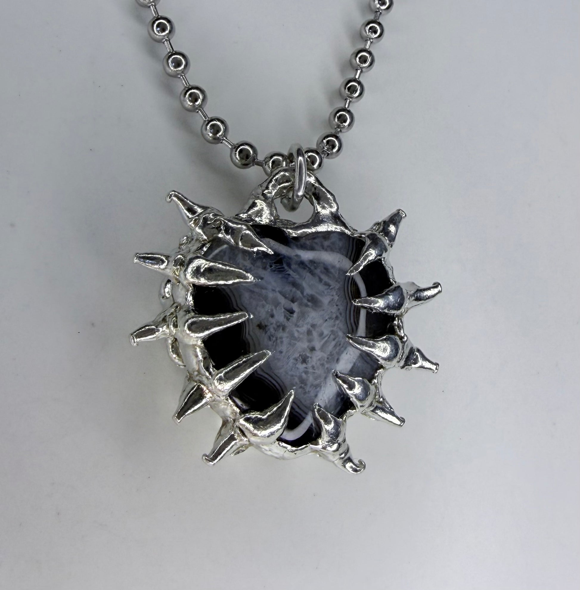 A large statement black agate spiked heart necklace - stainless steel ball chain