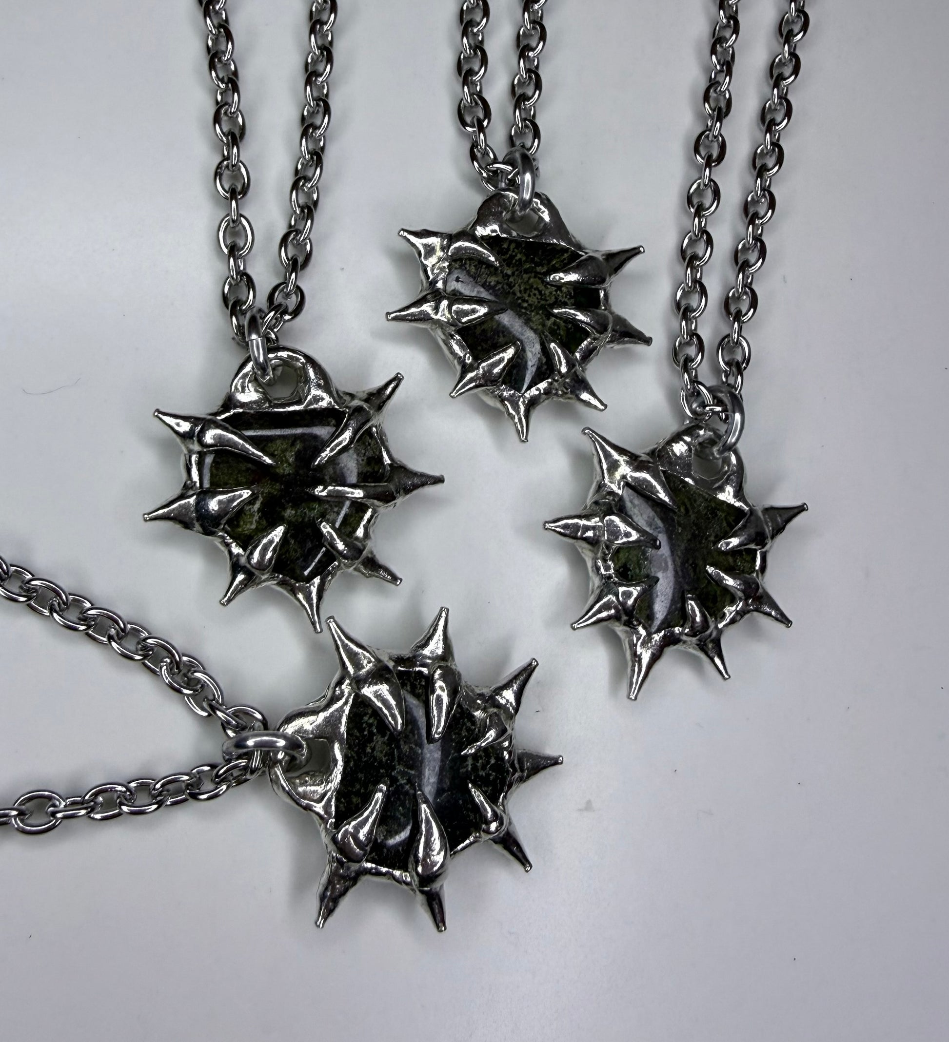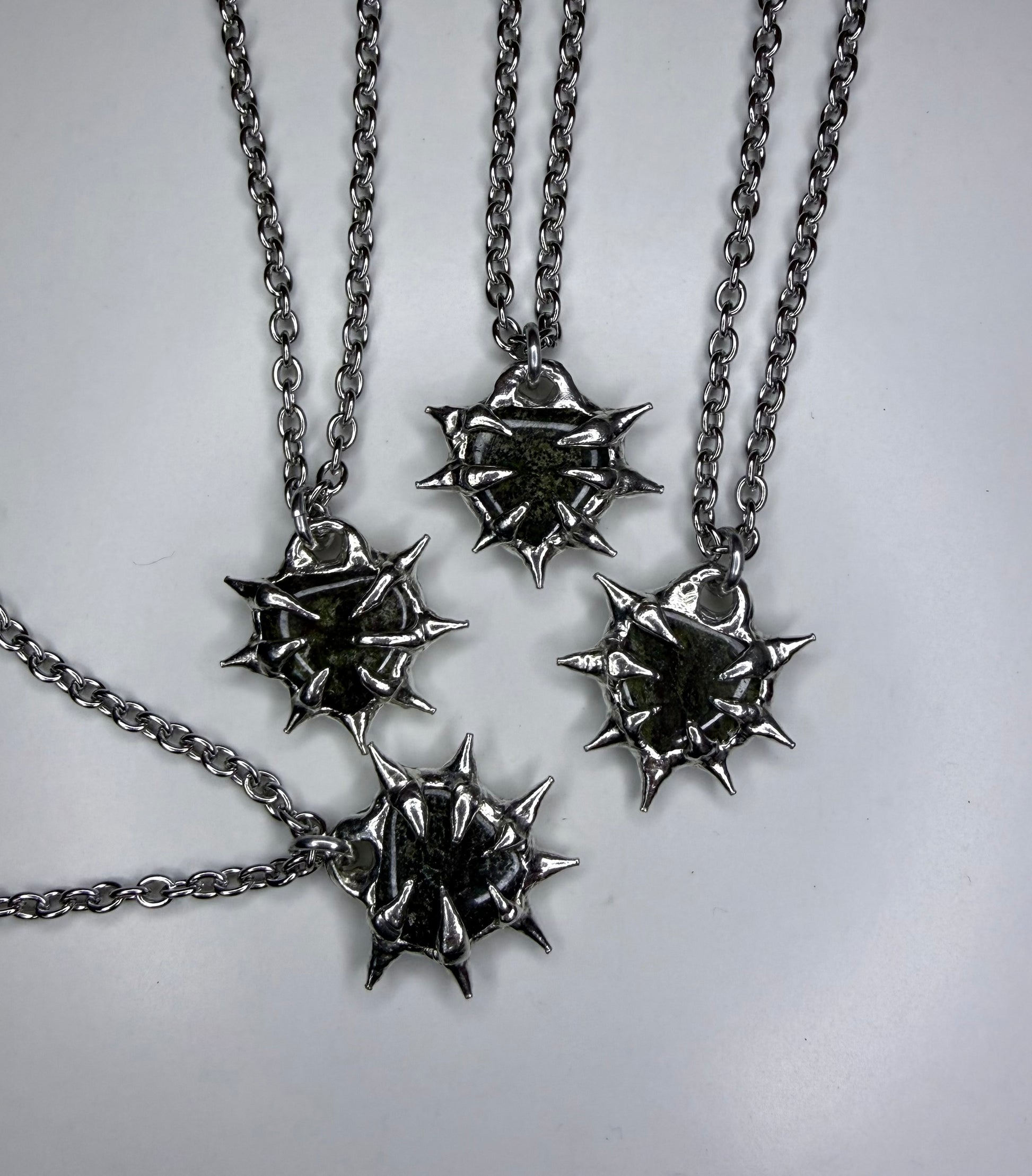 Spiked bloodstone crystal hearts, stainless steel chain