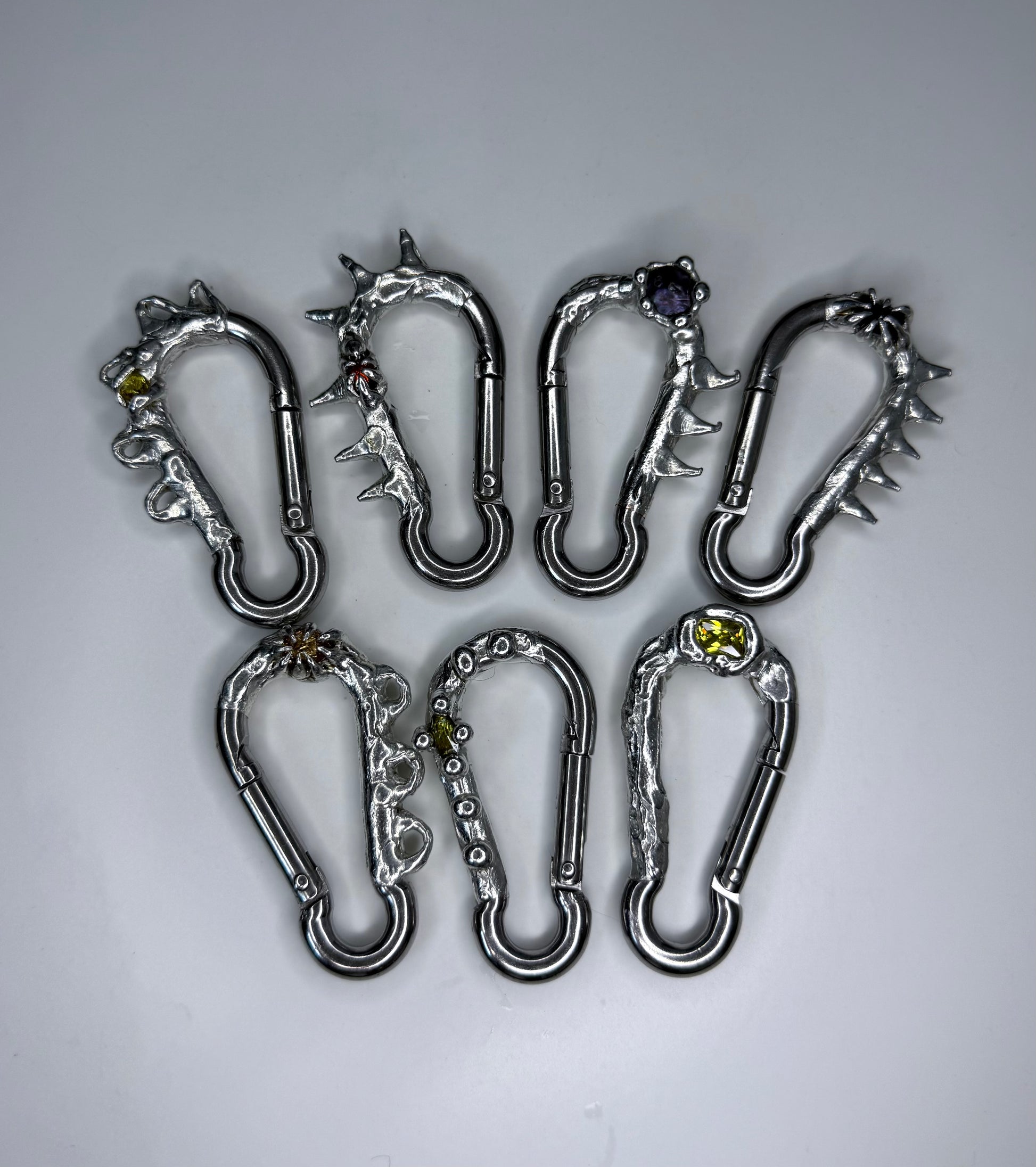 Beautiful handmade carabiners with organic shapes, spikes and swirls with cubic zirconias