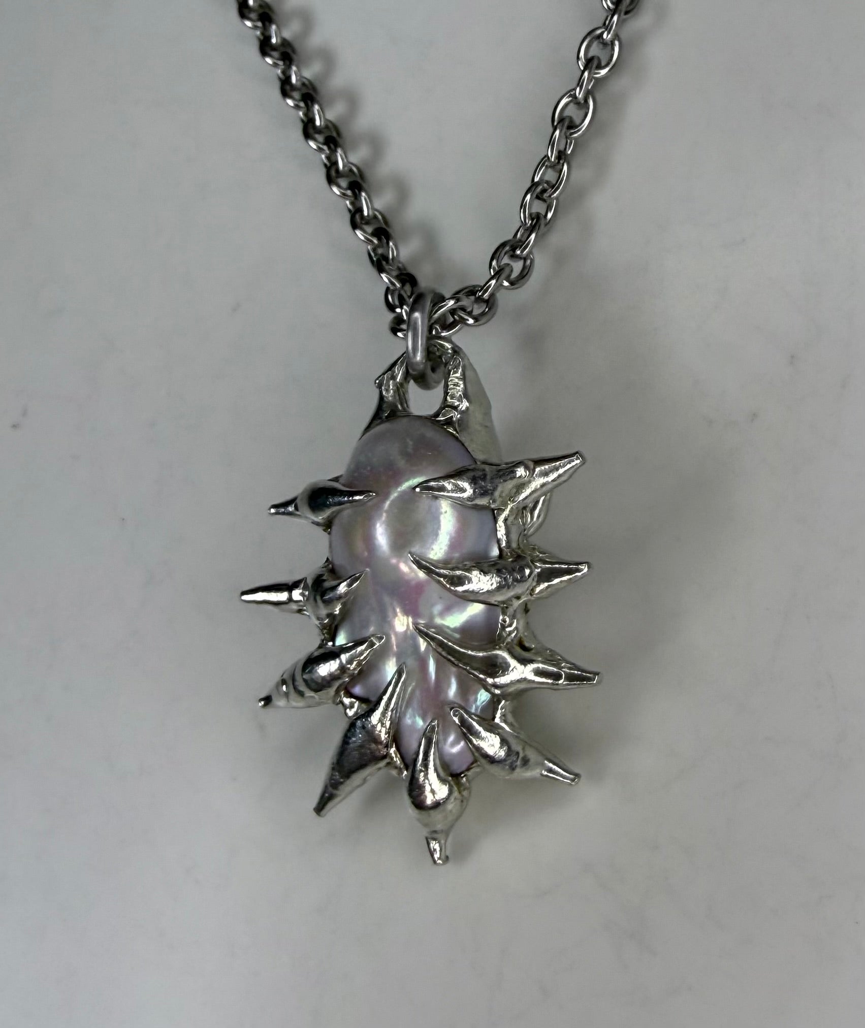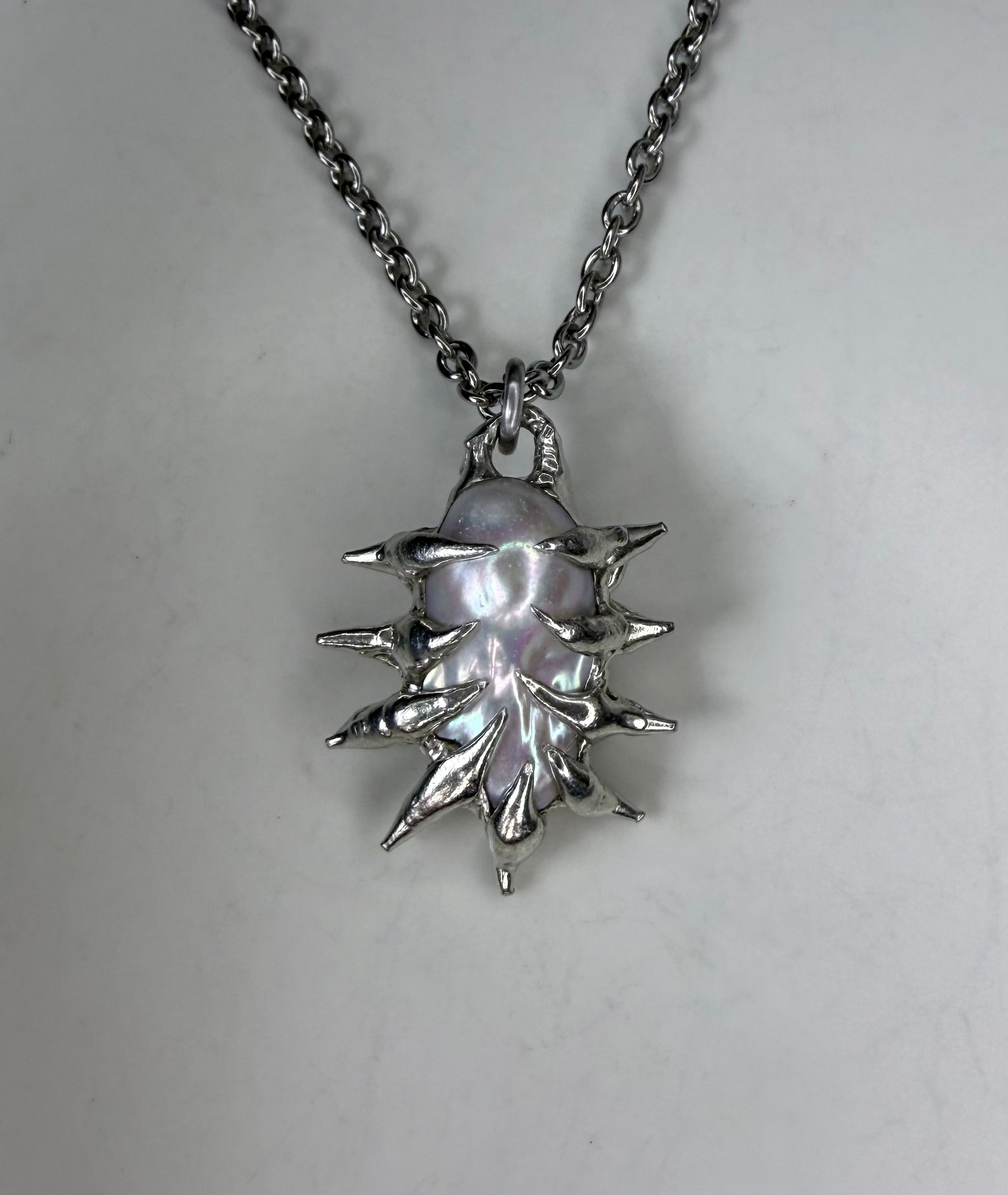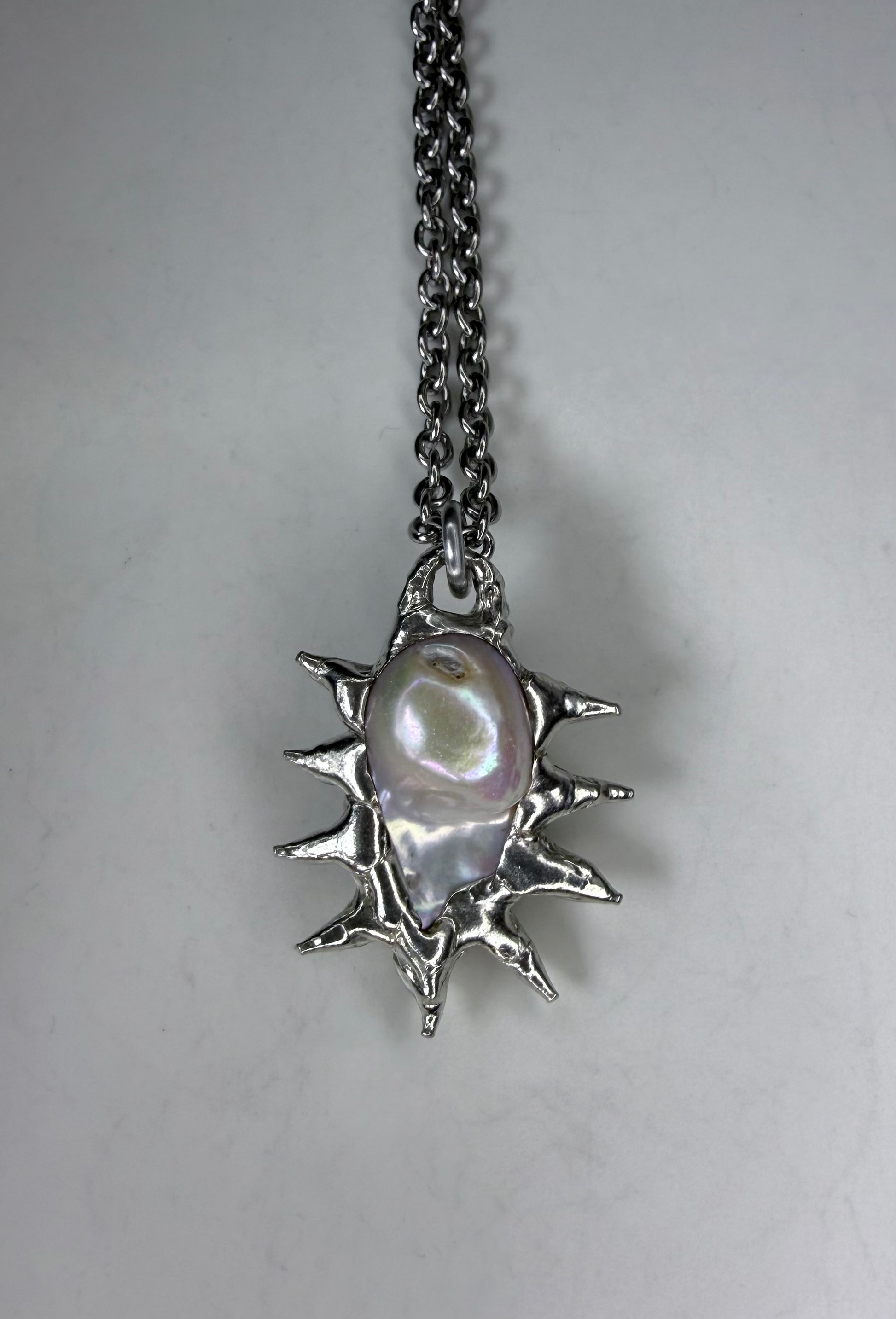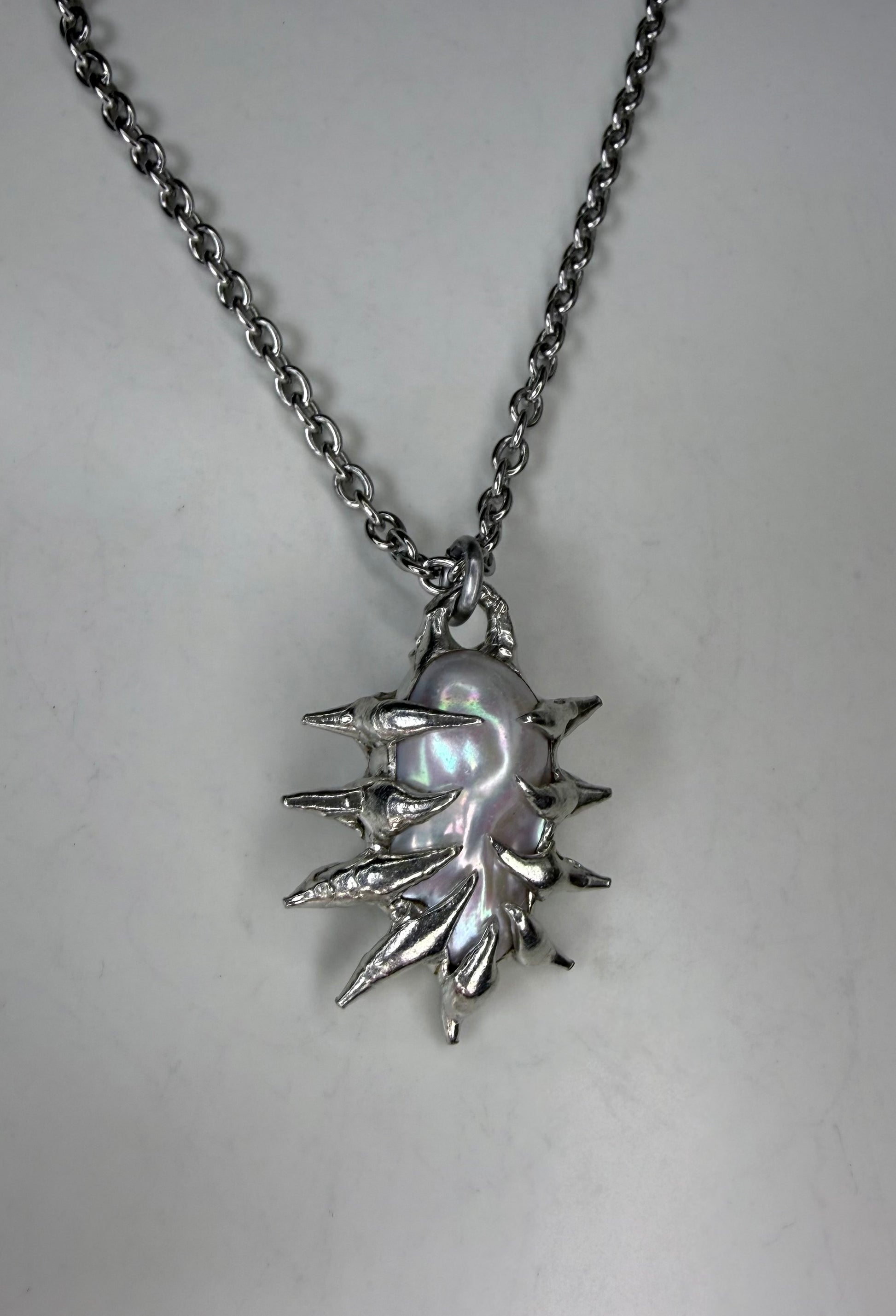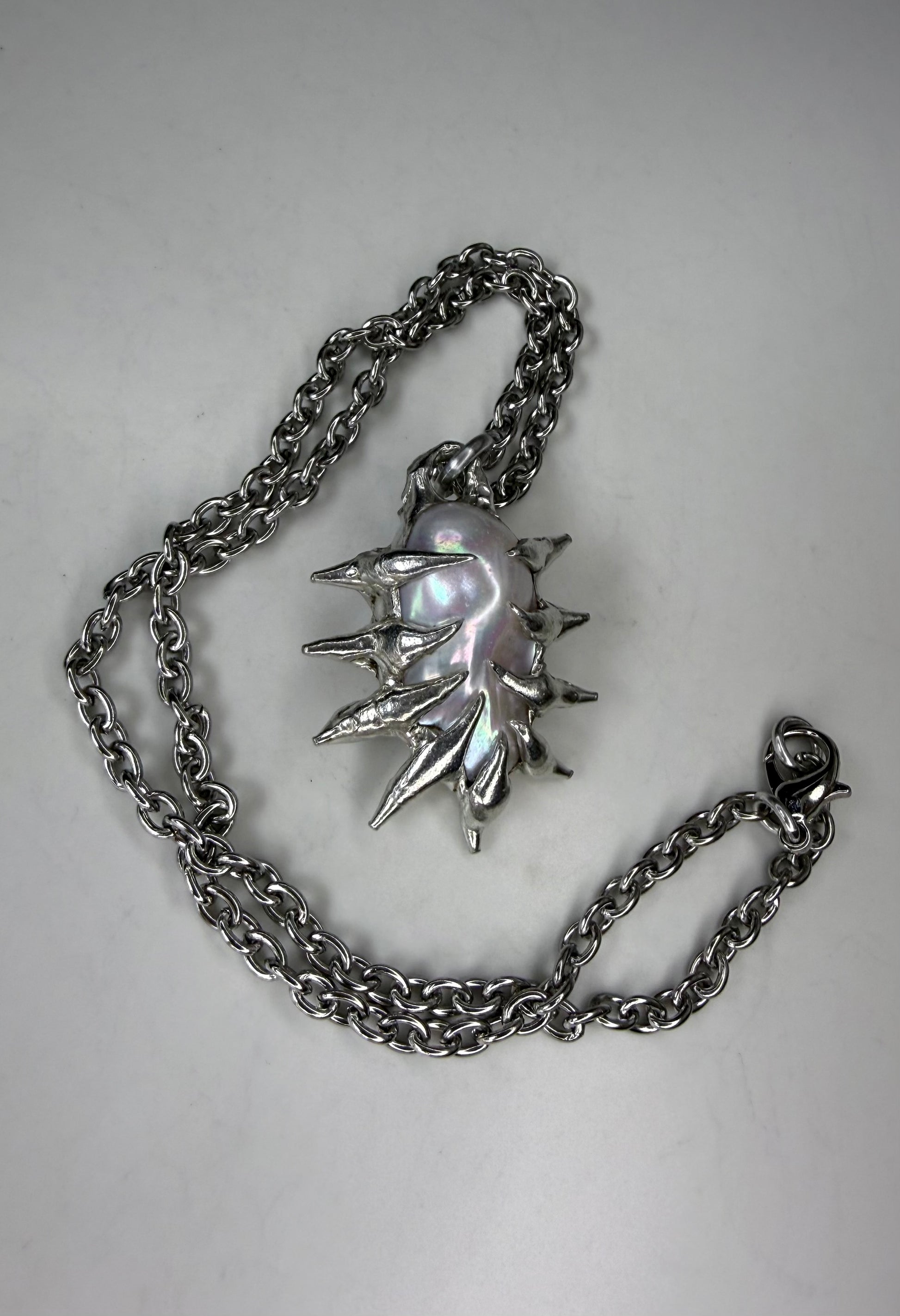 A large and gorgeous baroque freshwater pearl covered in spikes, stainless steel chain