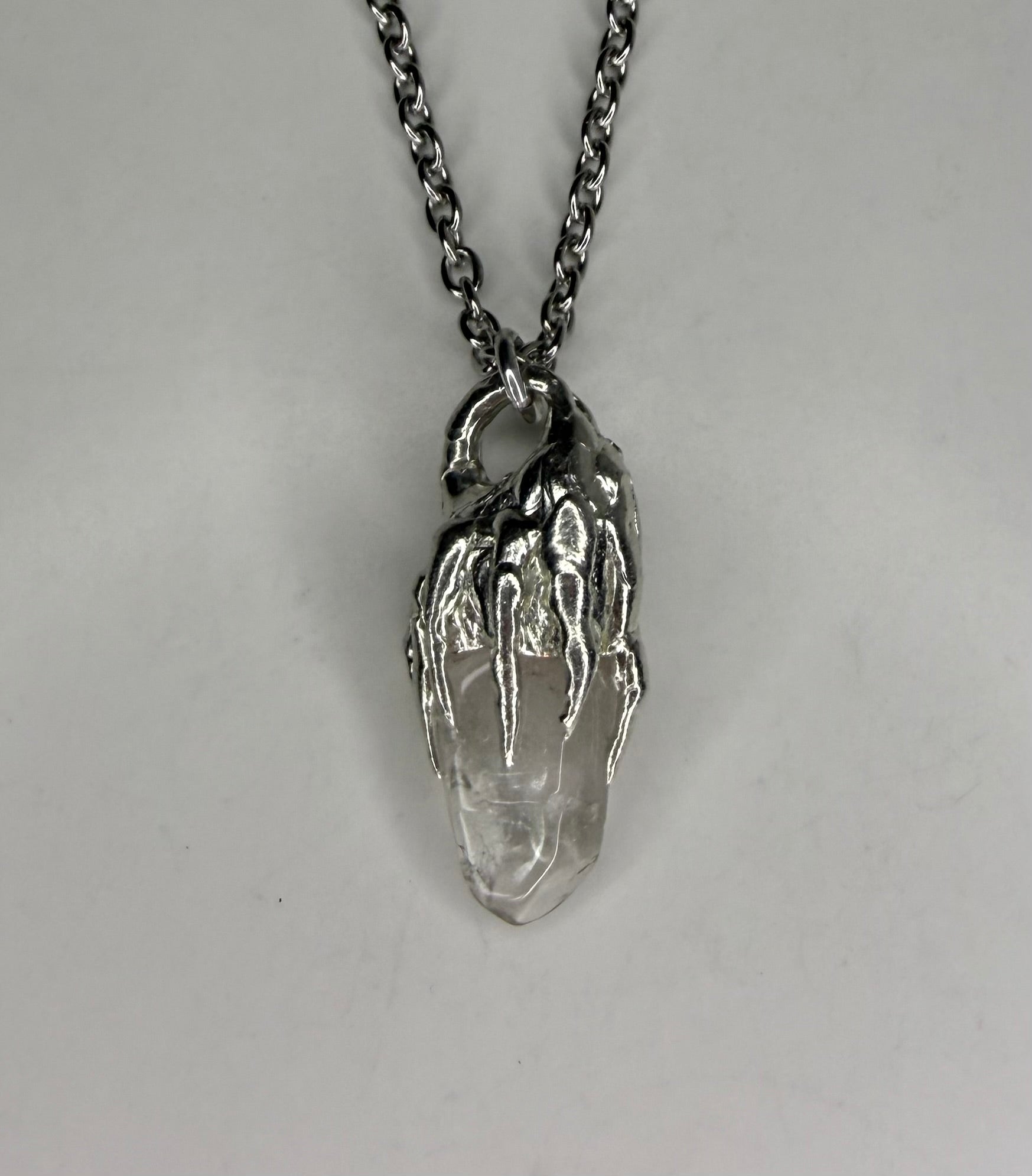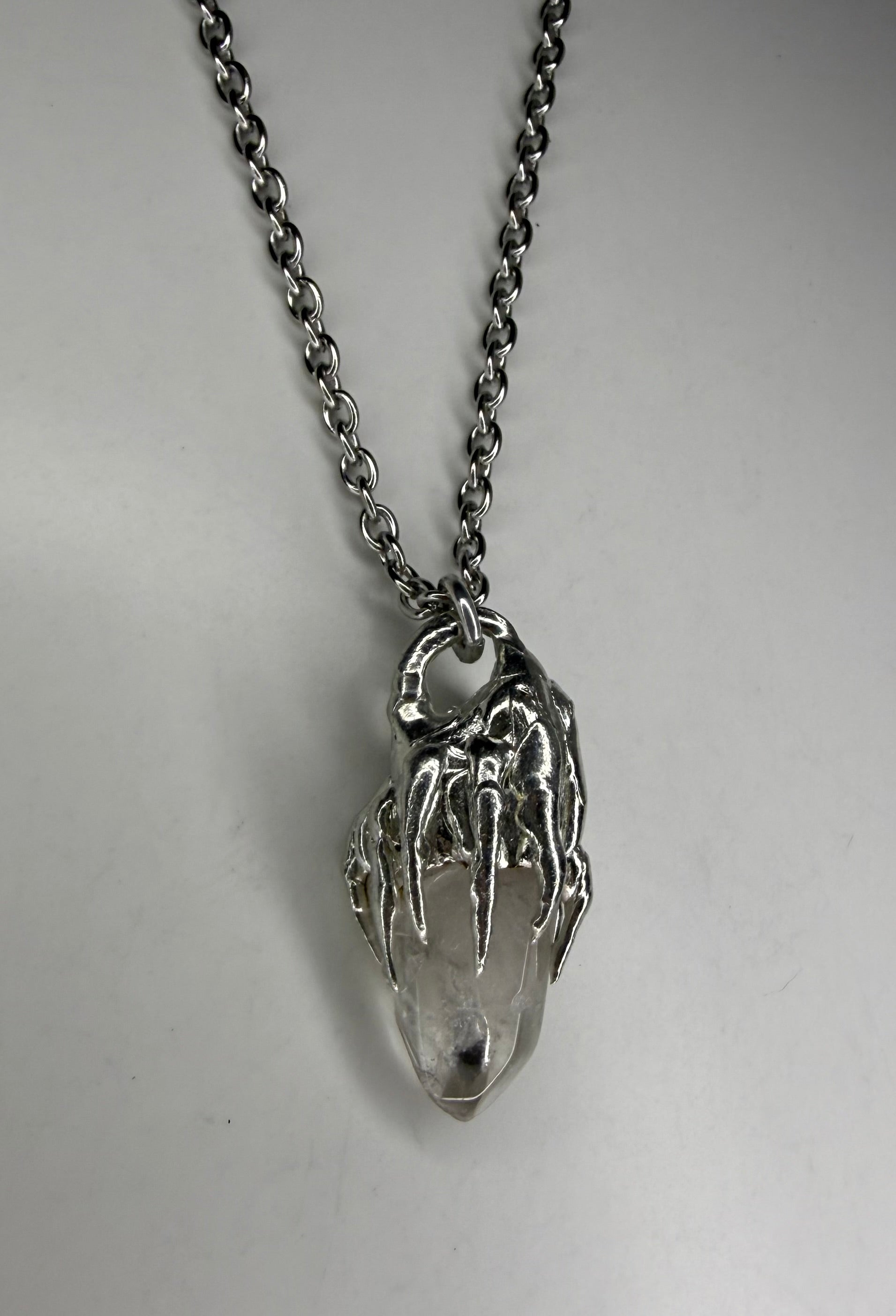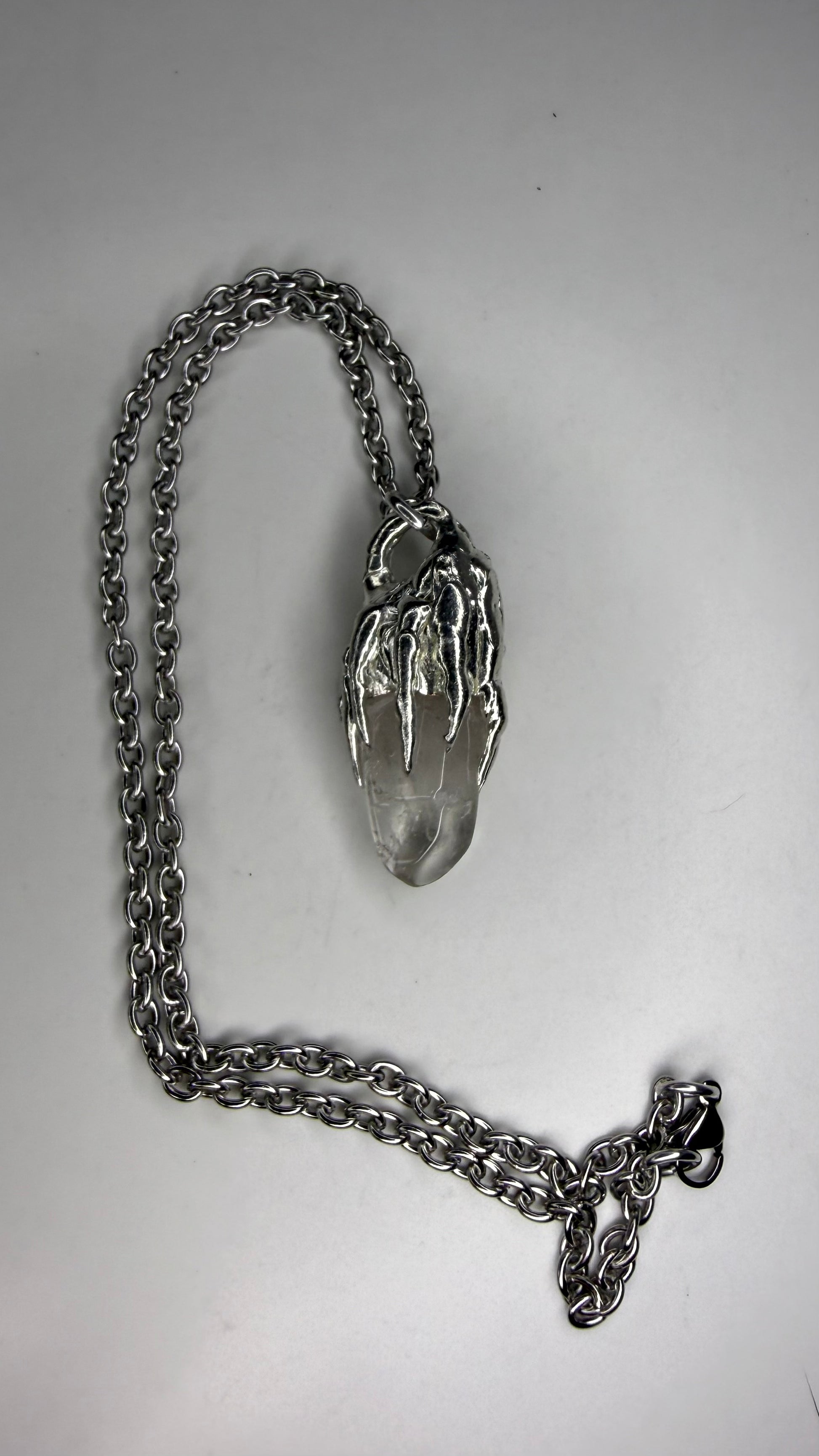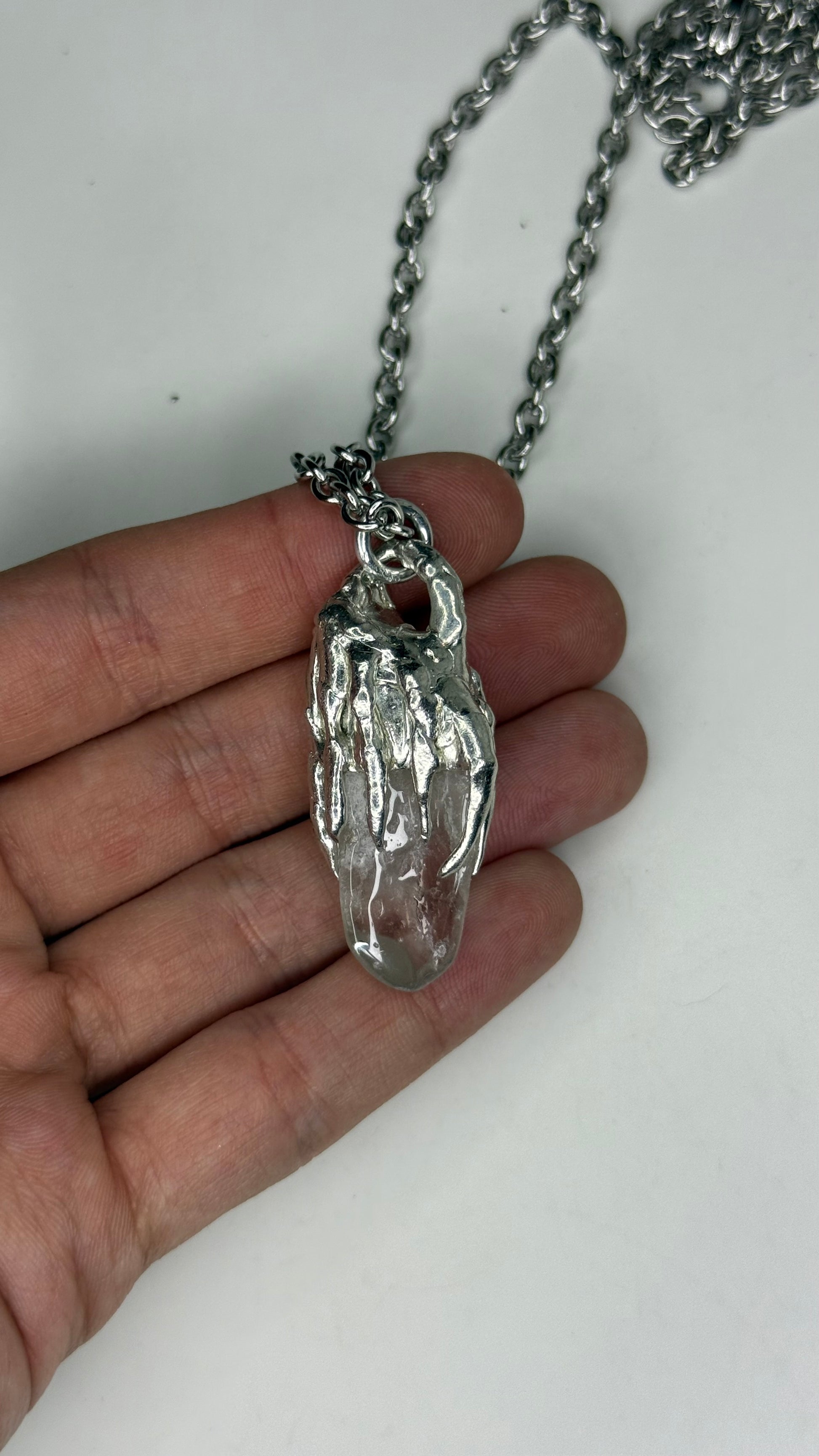 The melted metal necklace features a unique melted spiked design on a quarts crystal. Stainless steel chain