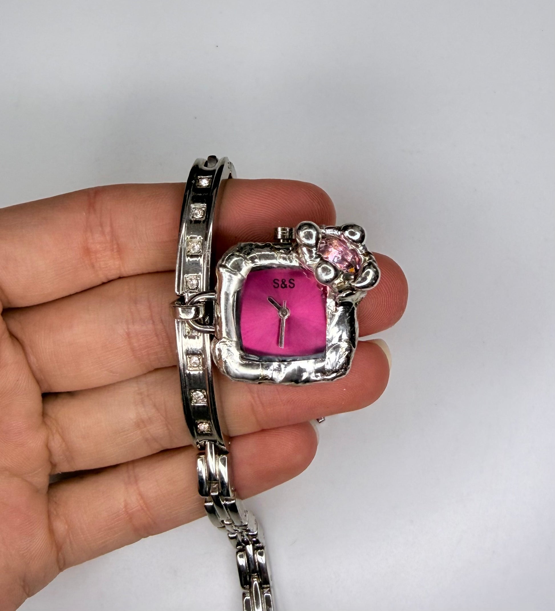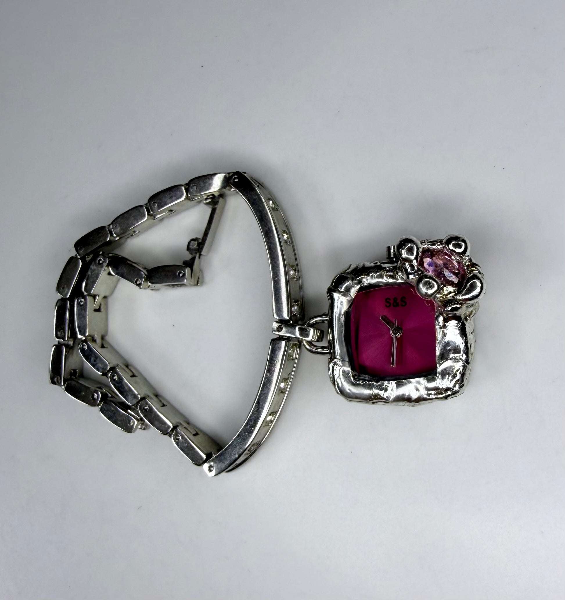 A gorgeous pink watch featuring a unique design with a gem stubbed band and a pink cubic zirconia