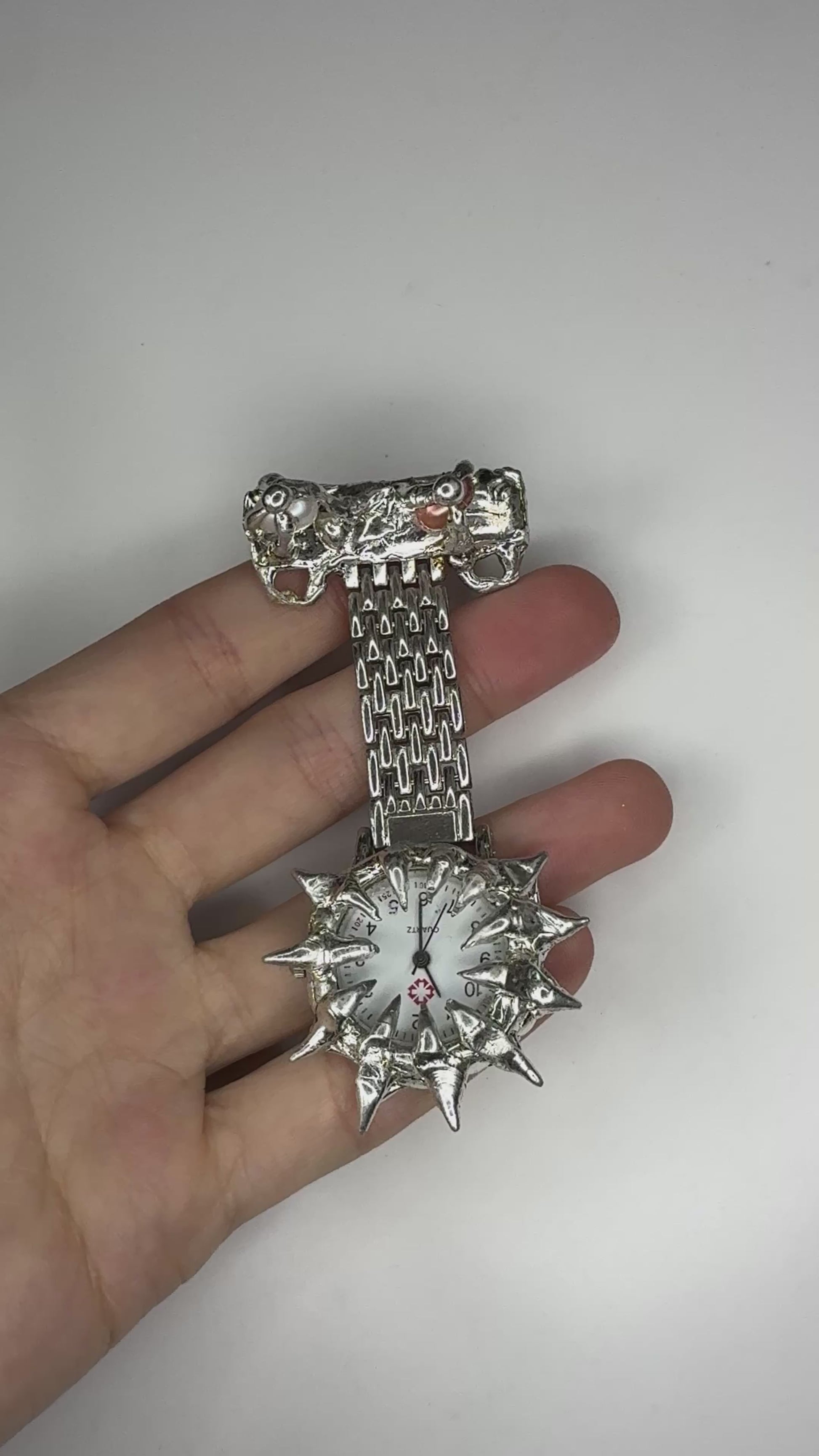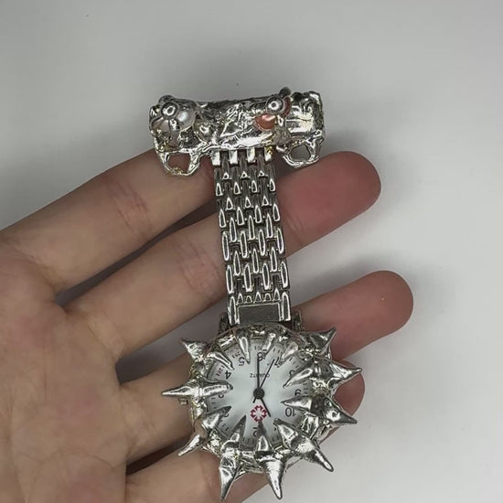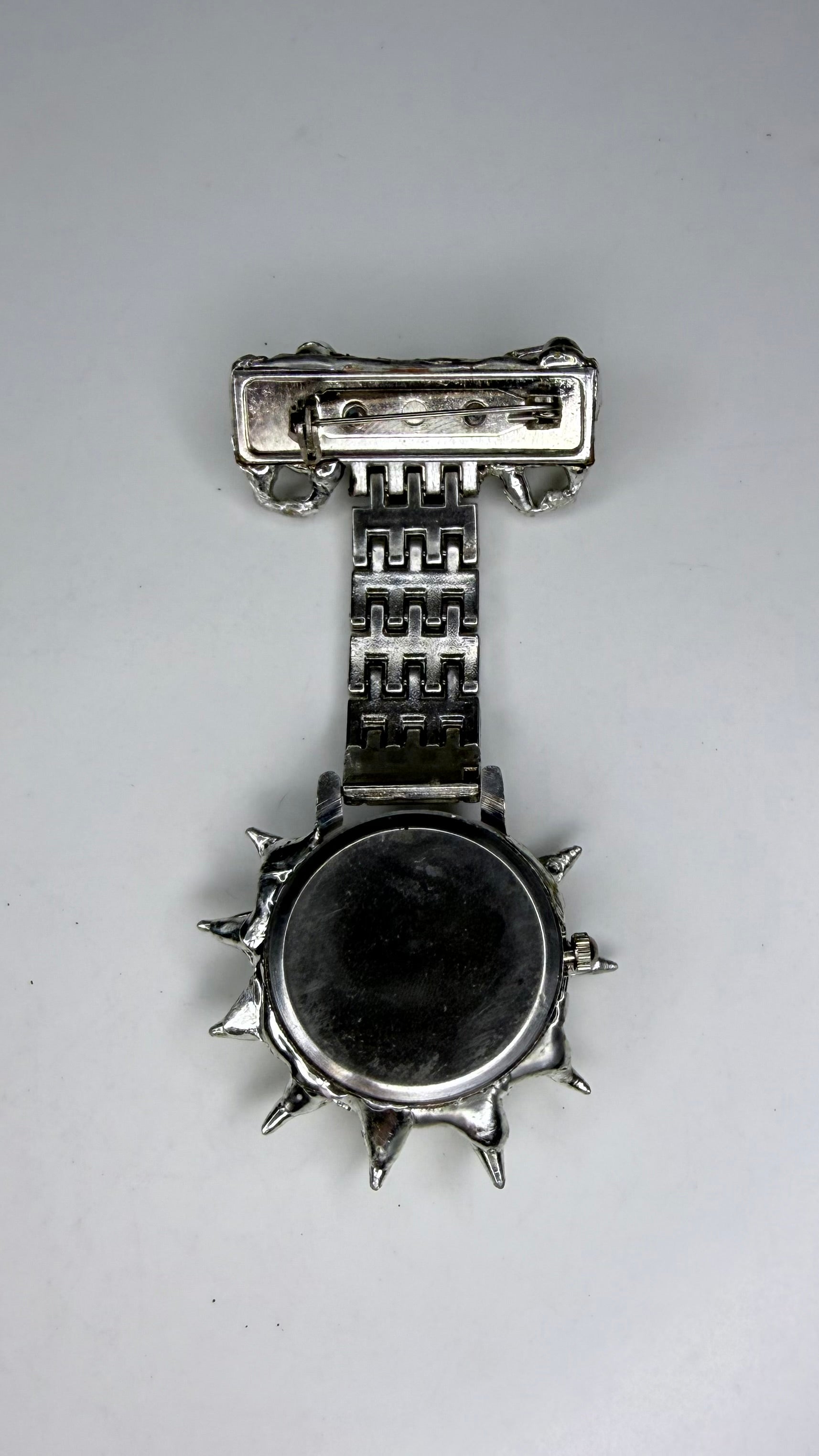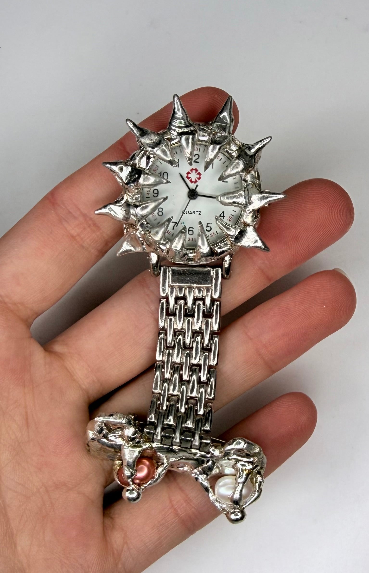 A unique broach watch featuring a spiked design with freshwater pearls on the clip